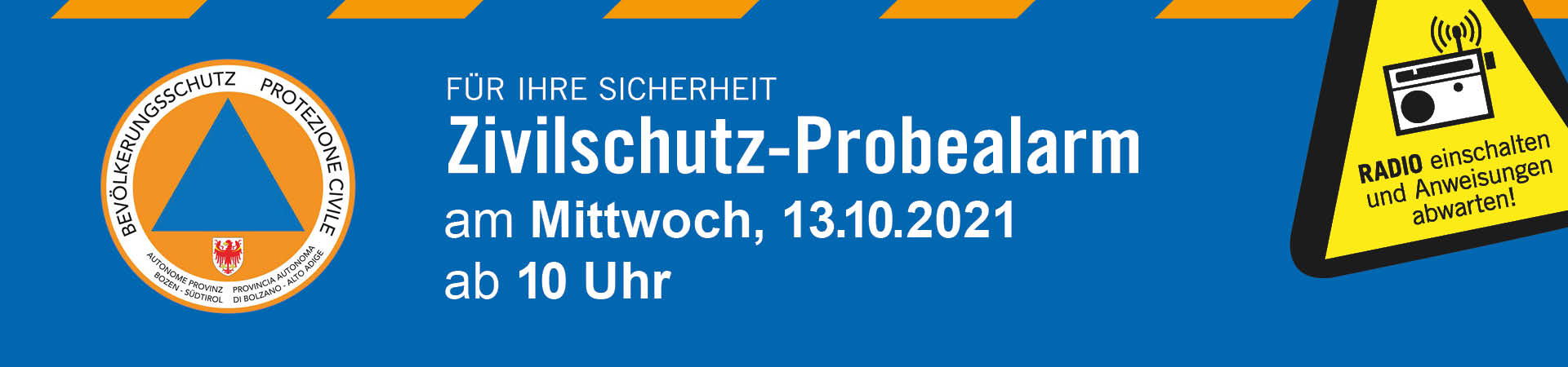 Heute Mittwoch, den 13. Oktober 2021 wird in Südtirol der Zivilschutz-Probealarm durchgeführt. Kurz nach 10.00 Uhr wird landesweit eine Minute lang der Zivilschutzalarm mit einem auf- und abschwellenden Heulton der Zivilschutzsirenen zu hören sein. Wer den Zivilschutzalarm hört, muss Radio oder Fernsehen einschalten, wo im Notfall nützliche Informationen zur Verfügung gestellt werden. Nähere Informationen finden Sie auf der Internetseite der Agentur für Bevölkerungsschutz https://afbs.provinz.bz.it