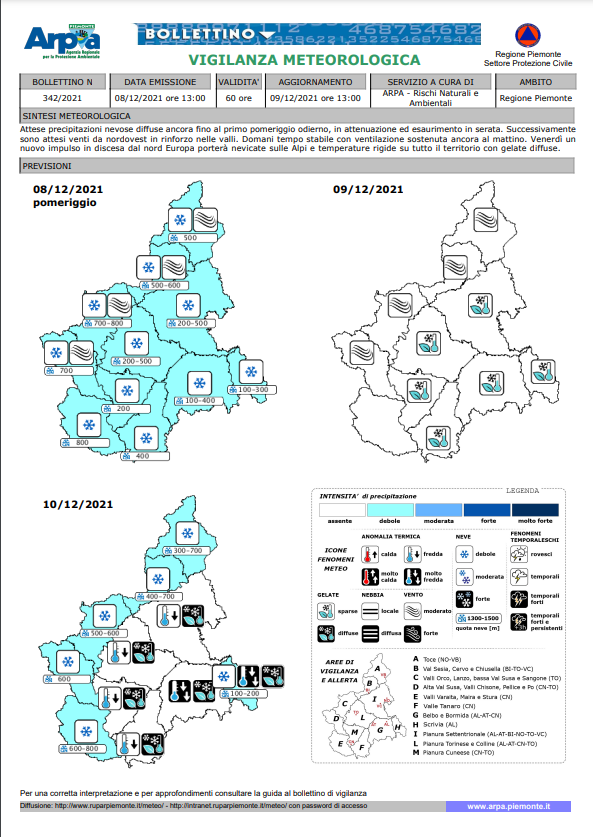 Pervenuto bollettino di aggiornamento meteo arpa indicante il perdurare dello stato di attenzione giallo per nevicate. La nota riporta "Attese precipitazioni nevose diffuse ancora fino al primo pomeriggio odierno, in attenuazione ed esaurimento in serata. Successivamente sono attesi venti da nordovest in rinforzo nelle valli. Domani tempo stabile con ventilazione sostenuta ancora al mattino. Venerdì un nuovo impulso in discesa dal nord Europa porterà nevicate sulle Alpi e temperature rigide su tutto il territorio con gelate diffuse". Il servizio di spalaneve e spargisale è in funzione dalla prima mattinata. La cittadinanza è comunque invitata a prestare attenzione sui potenziali effetti della precipitazione. La protezione civile monitora la situazione e in caso di necessità verranno fornite ulteriori indicazioni. Fase adottata dalla struttura comunale - "di Attenzione".