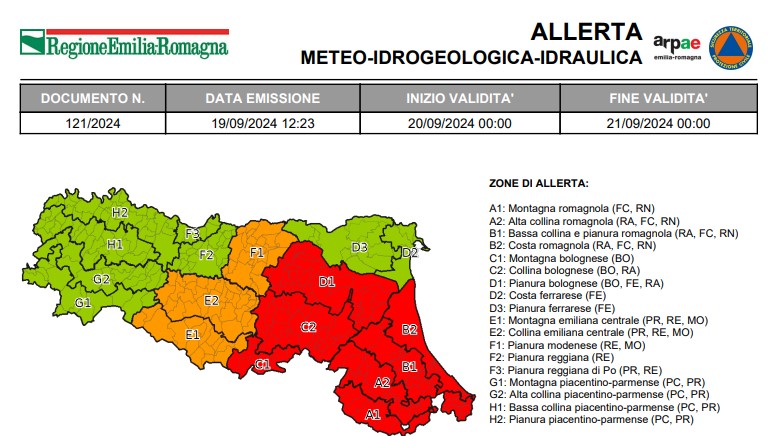 Il Servizio Meteo della Regione Emilia Romagna ha diramato anche per domani, VENERDI’ 20 SETTEMBRE, un’allerta di colore arancione sul nostro territorio. Nella giornata sono previste infatti precipitazioni deboli sull'Appennino orientale che però, in considerazione delle elevate precipitazioni cumulate e di quelle previste sulle aree montane centro-orientali, manterranno livelli idrometrici sostenutie diffuse condizioni di criticità idrogeologica. Si prevede un lento esaurimento delle piene in atto nei tratti vallivi dei corsi d'acqua del settore centro-orientale. L’allerta resta di colore rosso sul bolognese e sulla Romagna a causa delle gravi problematiche già presenti su quel territorio