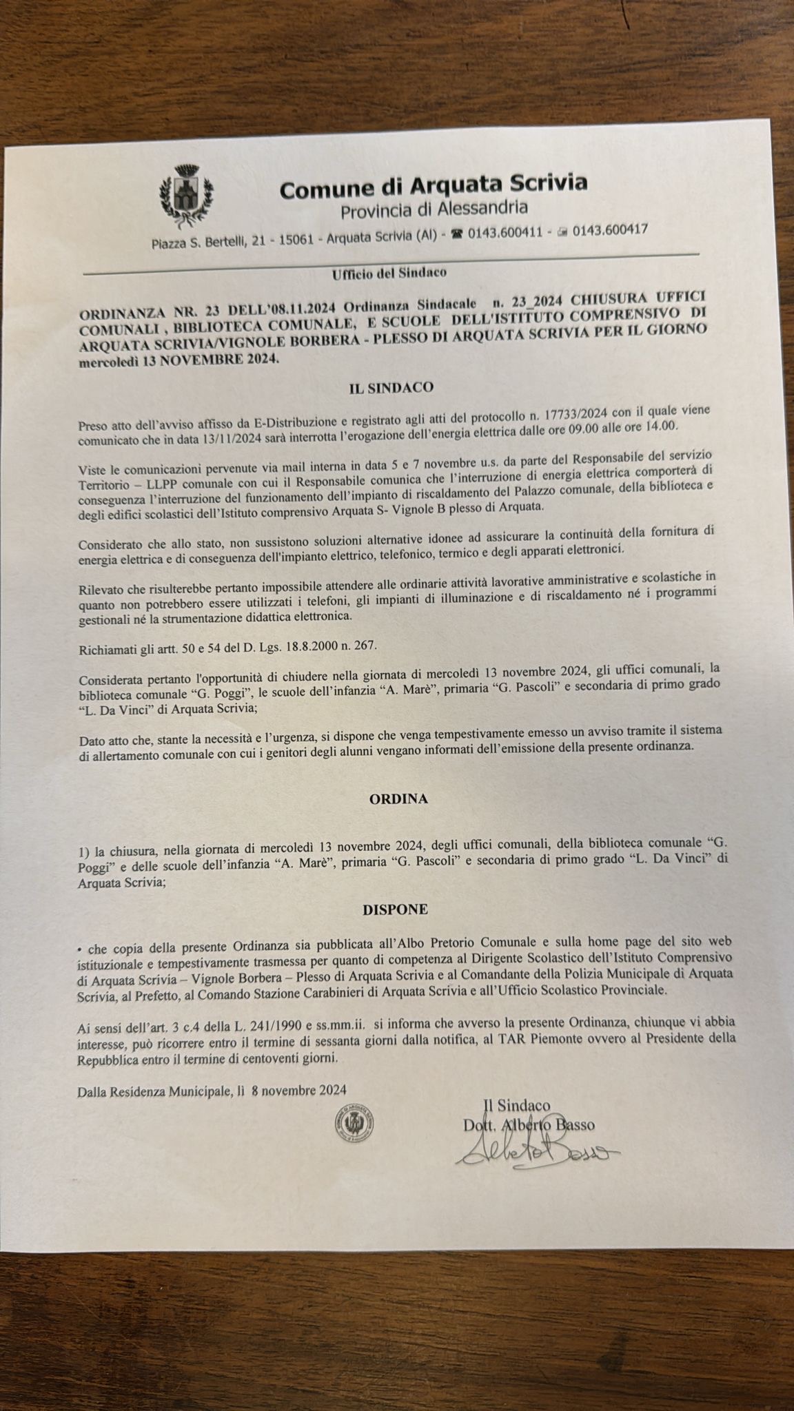 Attesa l’interruzzione del servizio elettrico il giorno di mercoledì 13 novembre p.v. Il Sindaco, con Ordinanza n. 23/2024, ha disposto per detta giornata la chiusura degli uffici comunali, della biblioteca e delle scuole Maré, Pascoli e Da Vinci.