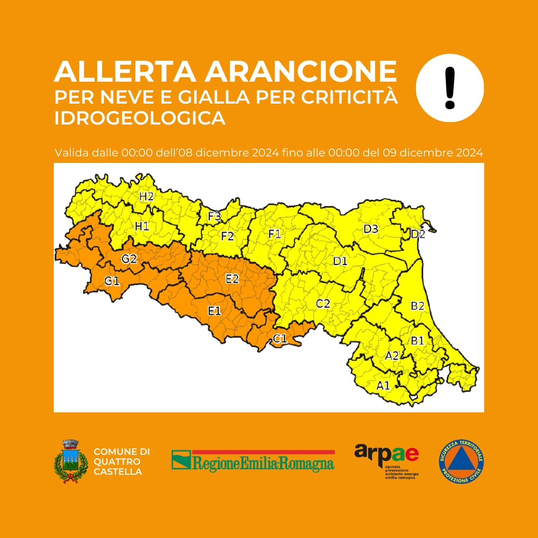 Il Servizio Meteo della Regione Emilia Romagna ha emesso una Allerta meteo ARANCIONE per NEVE valida dalle 00:00 dell'8 dicembre 2024 fino alle 00:00 del 9 dicembre 2024. Sono previste precipitazioni moderate, localmente anche elevate sulle zone di pianura emiliana, che assumeranno carattere nevoso (o di pioggia mista a neve) inizialmente anche in pianura durante le prime ore del mattino, per poi risalire nella mattina e assestarsi sui 300/400 metri sull'Appennino emiliano. Saranno possibili localizzati fenomeni franosi, ruscellamenti lungo i versanti e innalzamenti dei livelli idrometrici nel reticolo minore, più diffusi nei settori collinari.