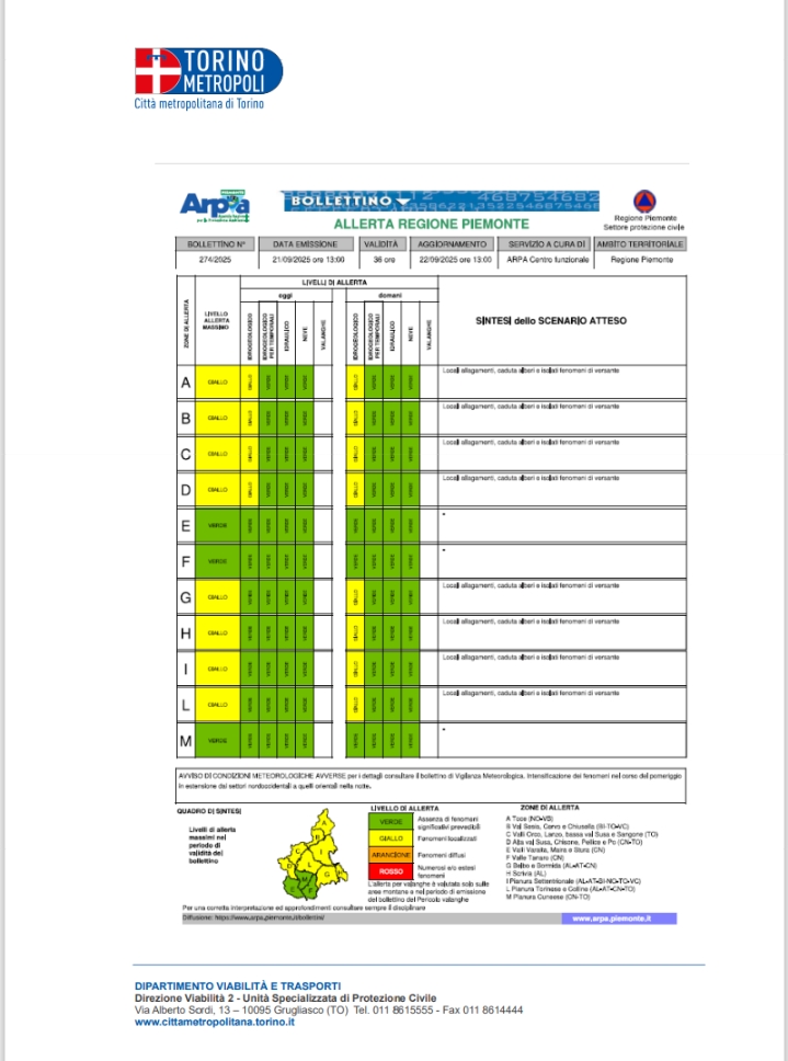 La Regione Piemonte, tramite il Centro Funzionale dell'ARPA Piemonte, ha emesso una allerta Meteoidrologica di livello GIALLO per la giornata di oggi Domenica 21 Settembre e Lunedì 22 Settembre per il rischio idrogeologico con possibili locali allagamenti, caduta alberi, fulminazioni e isolati fenomeni di versante.