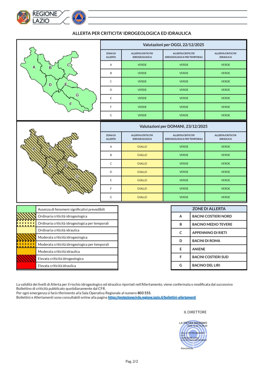 ALLERTAMENTO DEL SISTEMA DI PROTEZIONE CIVILE REGIONALE (Direttiva PCM 27/02/2004) PER I SEGUENTI RISCHI: CRITICITA’ IDROGEOLOGICA ED IDRAULICA . Si comunica che: La Presidenza del Consiglio dei Ministri - Dipartimento della Protezione Civile ha emesso l’Avviso di condizioni meteorologiche avverse n. 25092 del 22.12.2025, con indicazione che dal primo mattino di domani, martedì 23 Dicembre 2025, e per le successive 24-36 ore, si prevedono sul Lazio: precipitazioni sparse, anche a carattere di rovescio o temporale, specie sui settori costieri. I fenomeni saranno accompagnati da rovesci di forte intensità, frequente attività elettrica e forti raffiche di vento. Tenuto conto altresì delle caratteristiche spazio-temporali delle precipitazioni previste e della loro intensità, dello stato di saturazione dei suoli e dei livelli dei corsi d’acqua, nonché delle indicazioni rese disponibili dai presidi territoriali e dalla modellistica idrologica ed idraulica, della suddivisione del territorio regionale in Zone di Allerta, il Centro Funzionale Regionale ha effettuato la valutazione dei Livelli di Allerta/Criticità riportata nella seguente tabella. Si raccomanda attenzione per possibile rottura di rami, caduta di alberi e abbattimento di pali, segnaletica e impalcature con conseguenti effetti sulla viabilità e sulle reti aeree di comunicazione e di distribuzione di servizi (in particolare telefonia, elettricità);