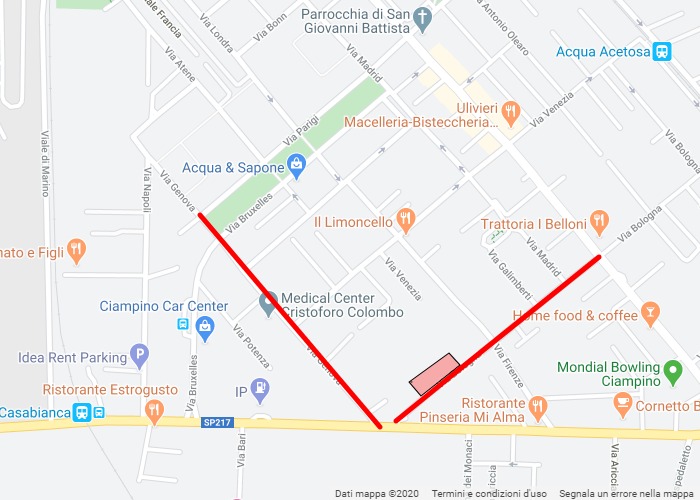 Via Bologna (tratto compreso tra v. Mura dei Francesi e v. Genova compreso parcheggio davanti scuola), via Genova (tratto tra via dei laghi e via Parigi): dalle ore 08 alle 12 di GIOVEDI' 09/07/2020 divieto di sosta con rimozione