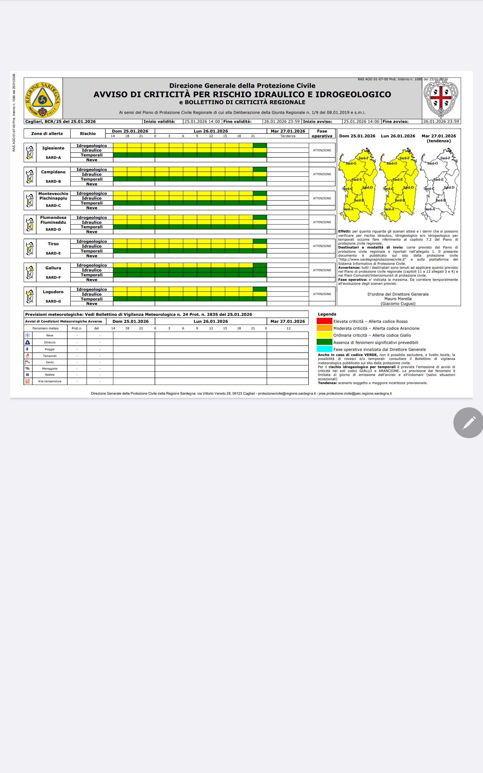 La Protezione Civile Regionale ha pubblicato un avviso di criticità per rischio idraulico e idrogeologico (criticità ORDINARIA, CODICE GIALLO), zona Gallura, Fase operativa regionale ATTENZIONE. Inizio validità - in proroga dell'allerta - dalle ore 14:00 del 25 gennaio 2026 e sino alle 23:59 del 26 gennaio 2026. Per maggior informazioni e norme di autoprotezione si veda www.sardegnaambiente.it/protezionecivile/