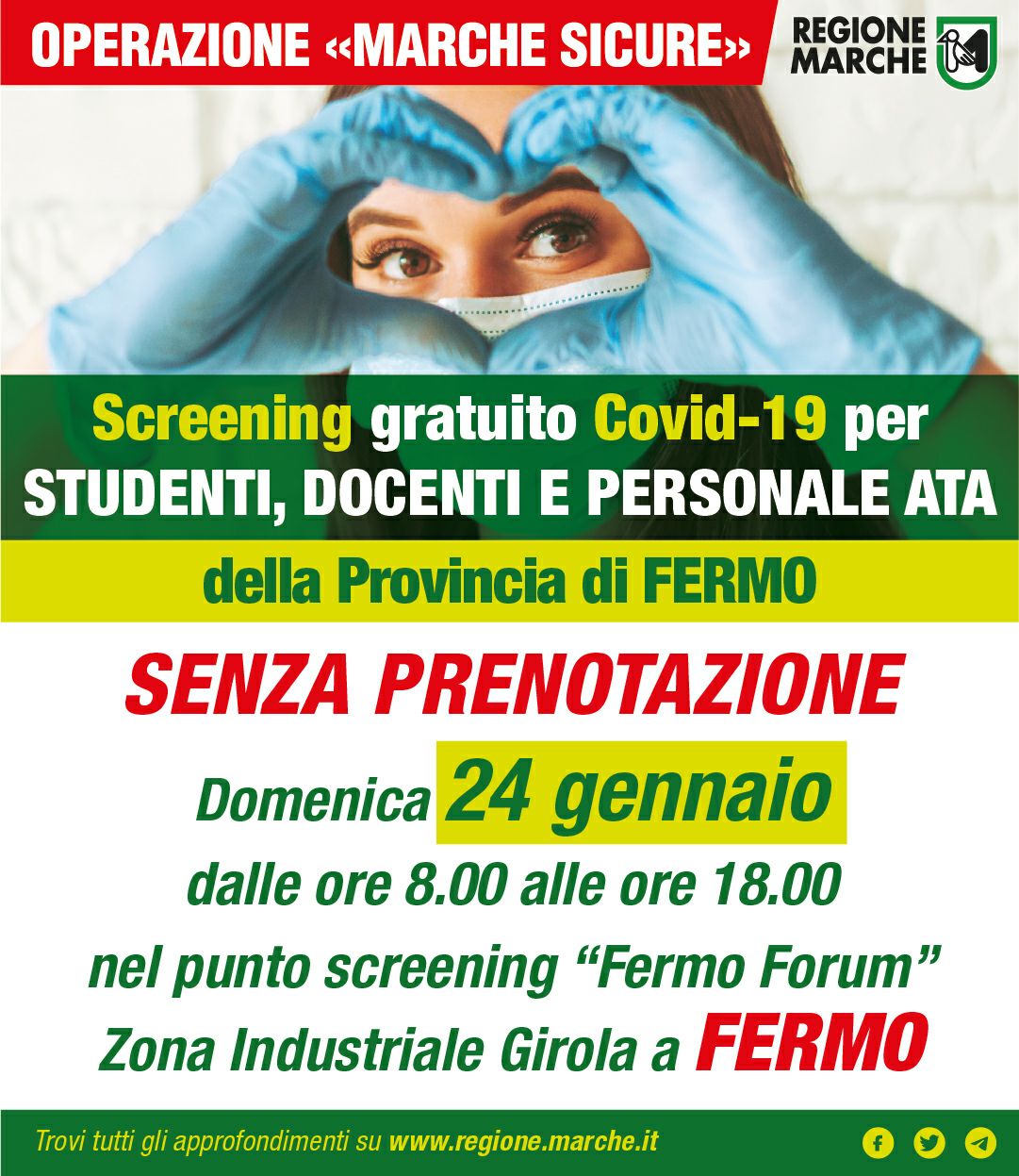 Lunedì 25 gennaio, con ordinanza del presidente della Regione Marche Francesco Acquaroli, gli studenti delle scuole superiori di secondo grado potranno finalmente riprendere il loro percorso formativo in presenza, anche se limitata al 50%. È stato disposto lo screening della popolazione scolastica, per quanto riguarda la nostra provincia di Fermo, per domenica 24 gennaio dalle 8 alle 18, senza necessità di alcuna prenotazione. Al Fermo Forum sarà quindi possibile sottoporsi al tampone rapido gratuitamente per studenti, insegnanti e personale ATA delle scuole superiori.